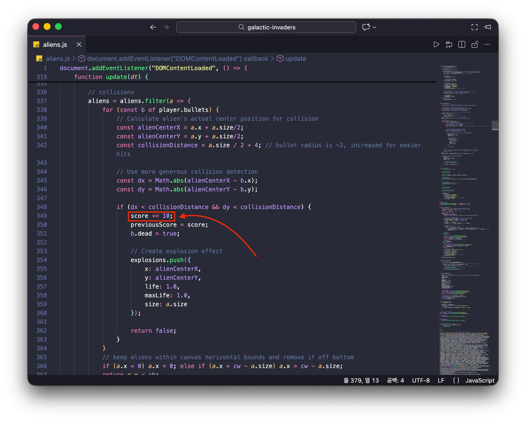 게임에서 점수는 10점씩 증가하는 것을 확인할 수 있습니다. 그리고 이 로직은 변수 난독화가 존재하지 않아 소스코드에서 쉽게 찾을 수 있었습니다.