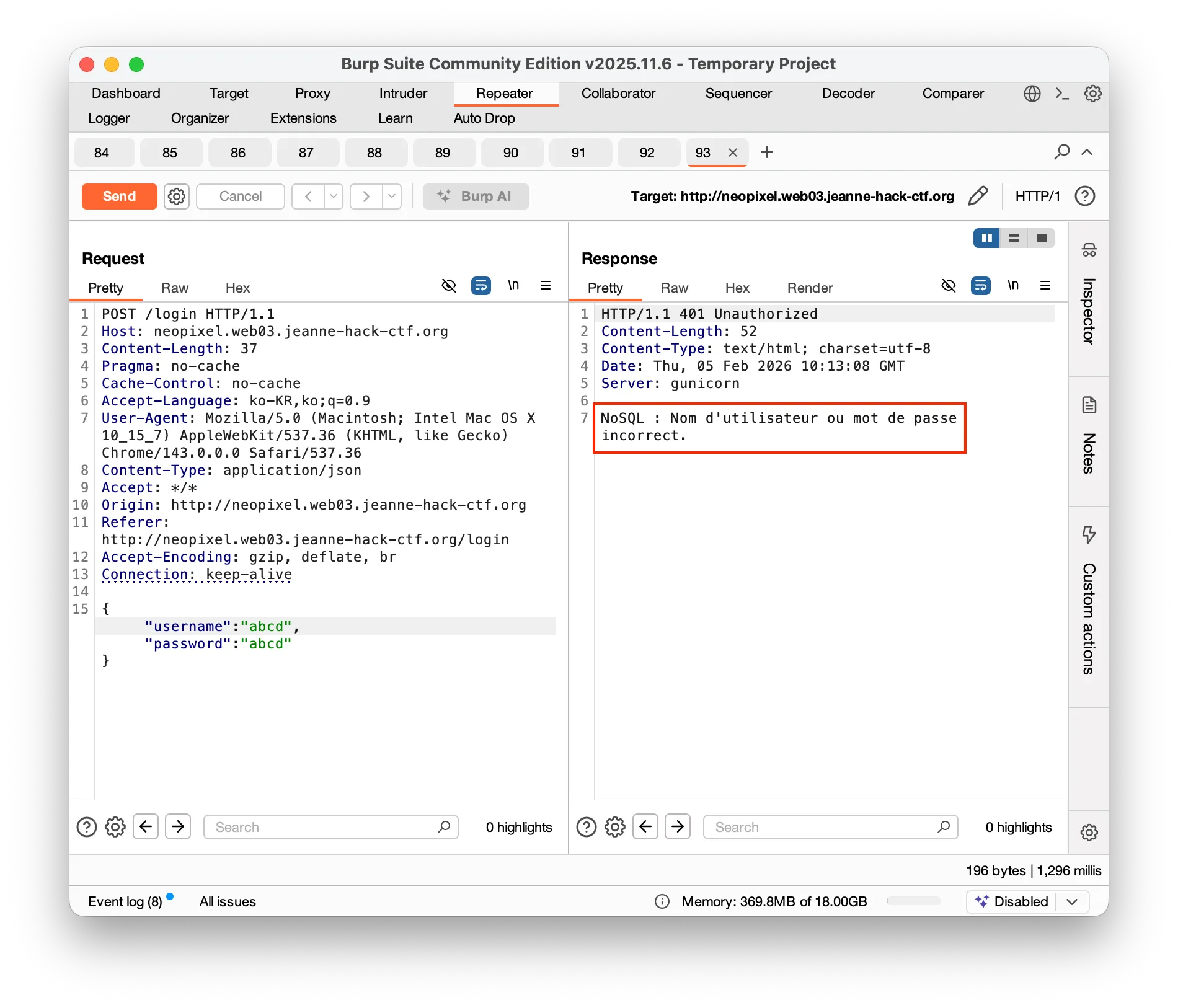 로그인 요청 API의 요청 데이터에 존재하지 않는 사용자의 정보를 입력할 경우 응답 데이터에서 NoSQL 에러가 발생하는 것을 발견했습니다.