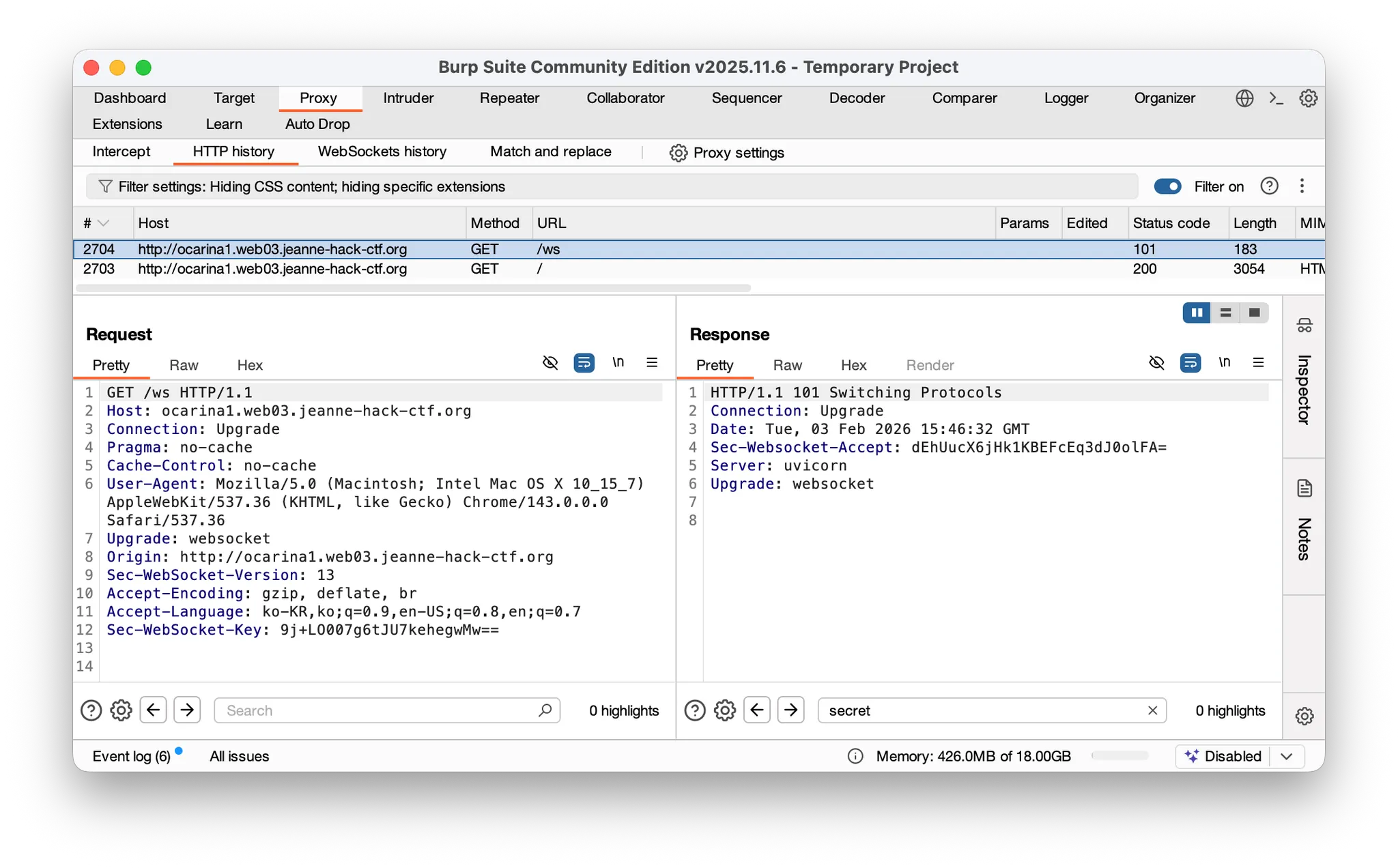 문제에서 제공하는 URL에 접속했을 때 송수신되는 네트워크 패킷을 살펴보면, 첫 화면(URL /)에서 start 버튼을 클릭했을 때, 웹 소켓이 연결(URL /ws 요청)되는 것을 확인할 수 있습니다.