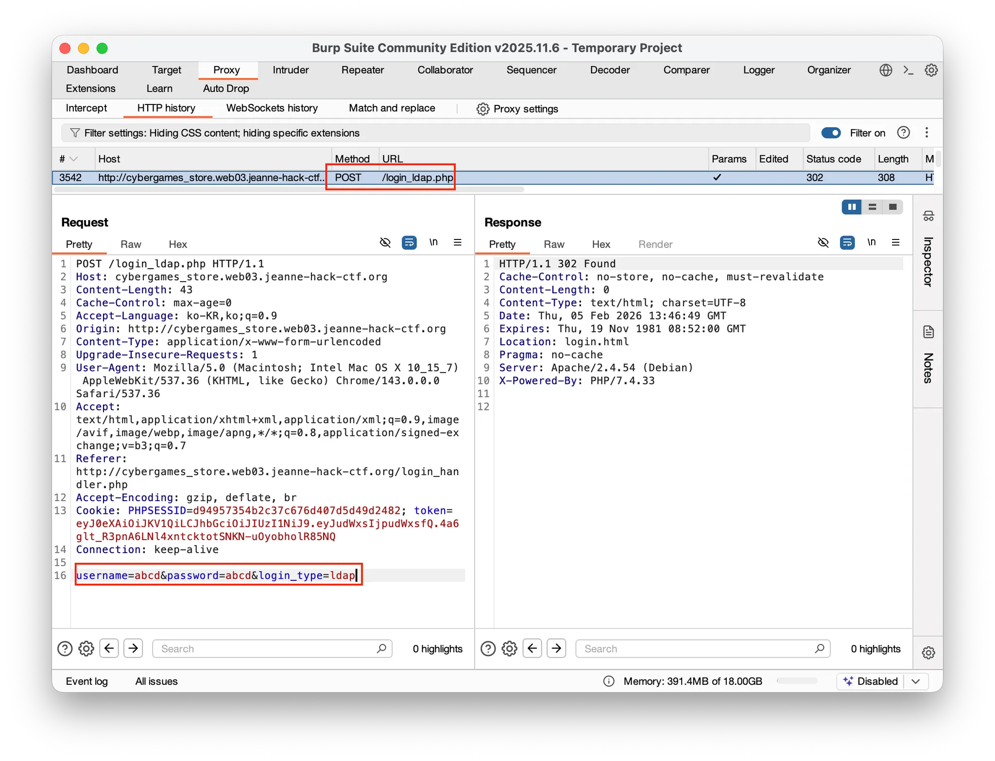 로그인 API /login_handler.php 의 요청 데이터 login_type 에 ‘ldap’ 를 전달하니 다음과 같이 login_ldap.php 로 다시 리다이렉션 되는 것을 발견하게되었습니다.