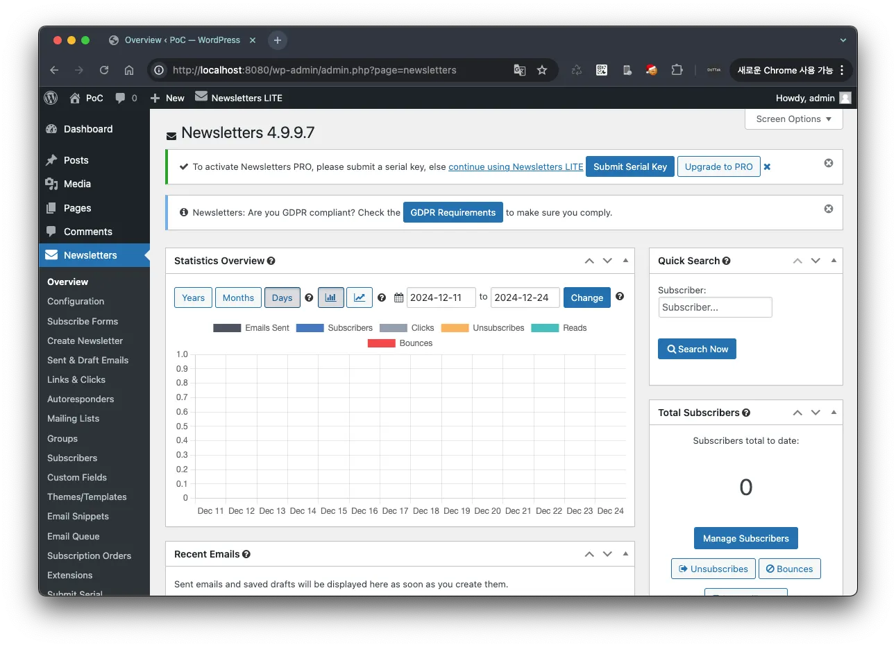 뉴스레터 플러그인의 대시보드 메뉴(/wp-admin/admin.php?page=newsletters) 로 이동합니다.