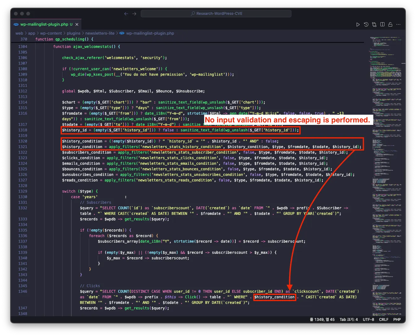 이때, 요청 파라미터 history_id 는 문자열로 이루어진 SQL 질의문의 조건절로 그대로 참조되어 변수 $history_condition 으로 초기화 됩니다. 이후 해당 변수는 아무런 이스케이프 처리 없이 데이터베이스 질의문으로 전달됩니다.