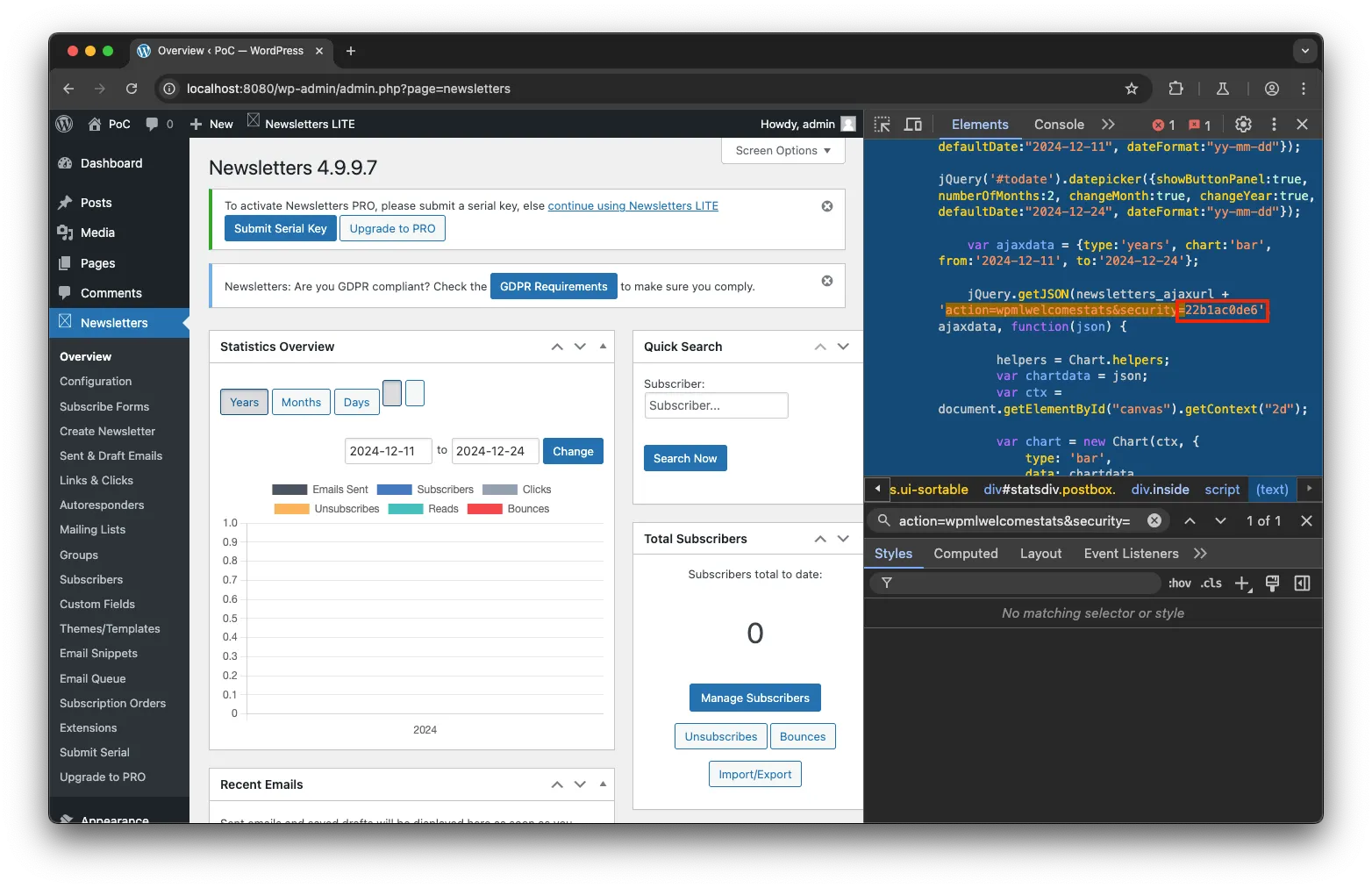 Newsletters 플러그인의 4.9.9.7 버전 또는 그 이하가 설치된 워드프레스 사이트를 준비합니다.