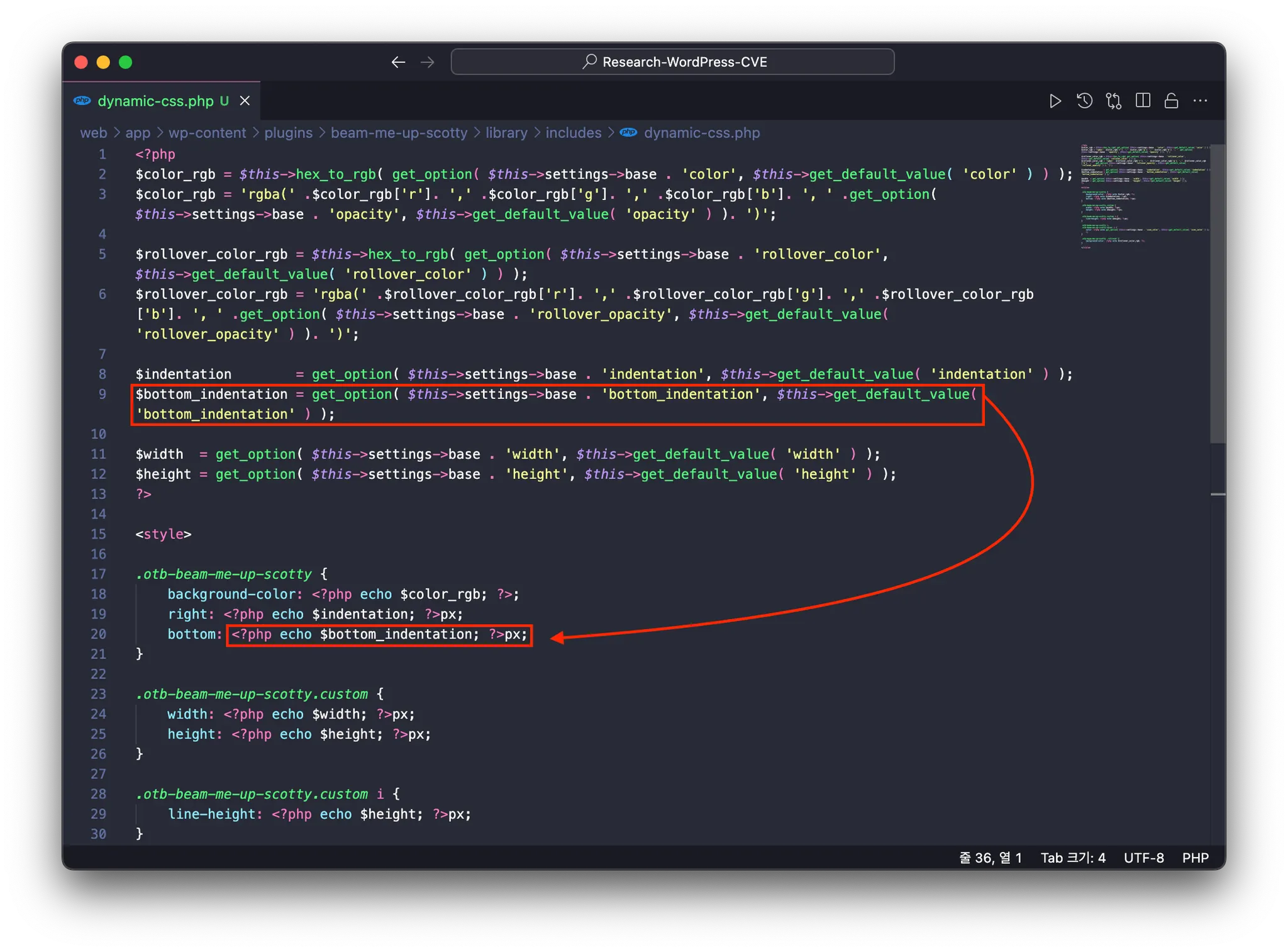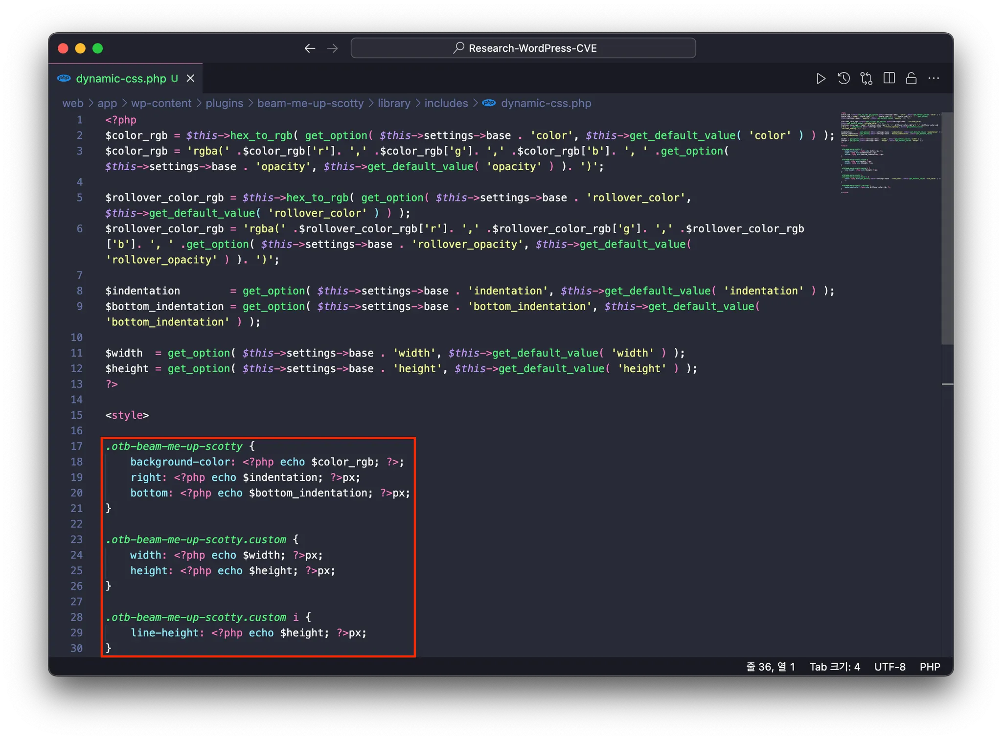 Beam me up Scotty 플러그인 1.0.23 이하 버전에서는 back to top 버튼의 커스터마이징 설정값에 대한 데이터 타입 유효성 검사와 이스케이프 처리가 불충분하여 저장형 크로스 사이트 스크립팅 취약점이 존재합니다.