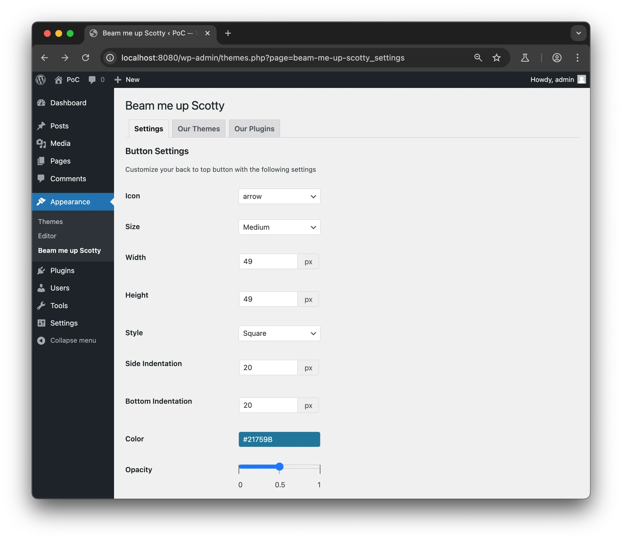 back top top 버튼을 커스터마이징 하기 위한 메뉴(/wp-admin/themes.php?page=beam-me-up-scotty_settings)로 이동합니다.