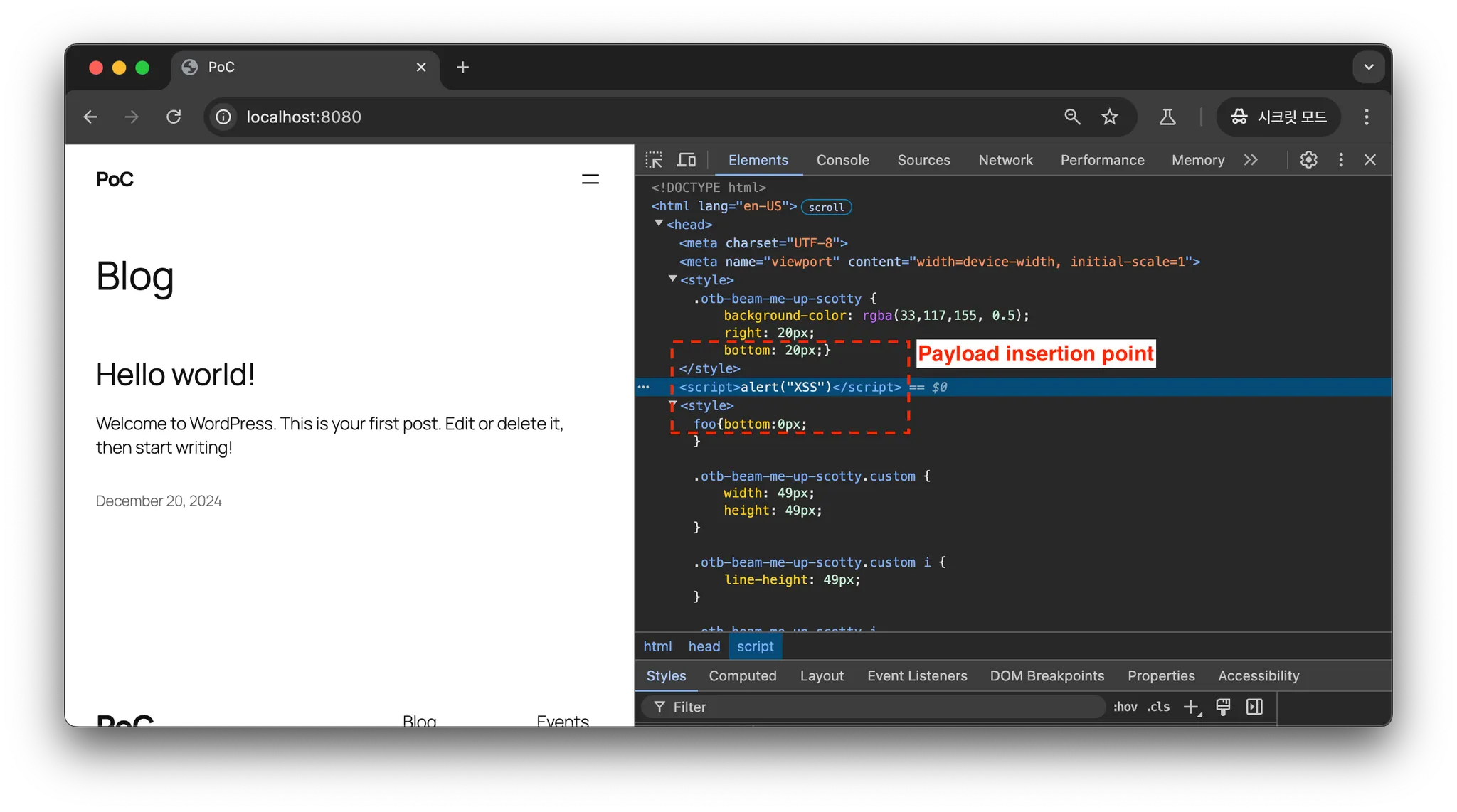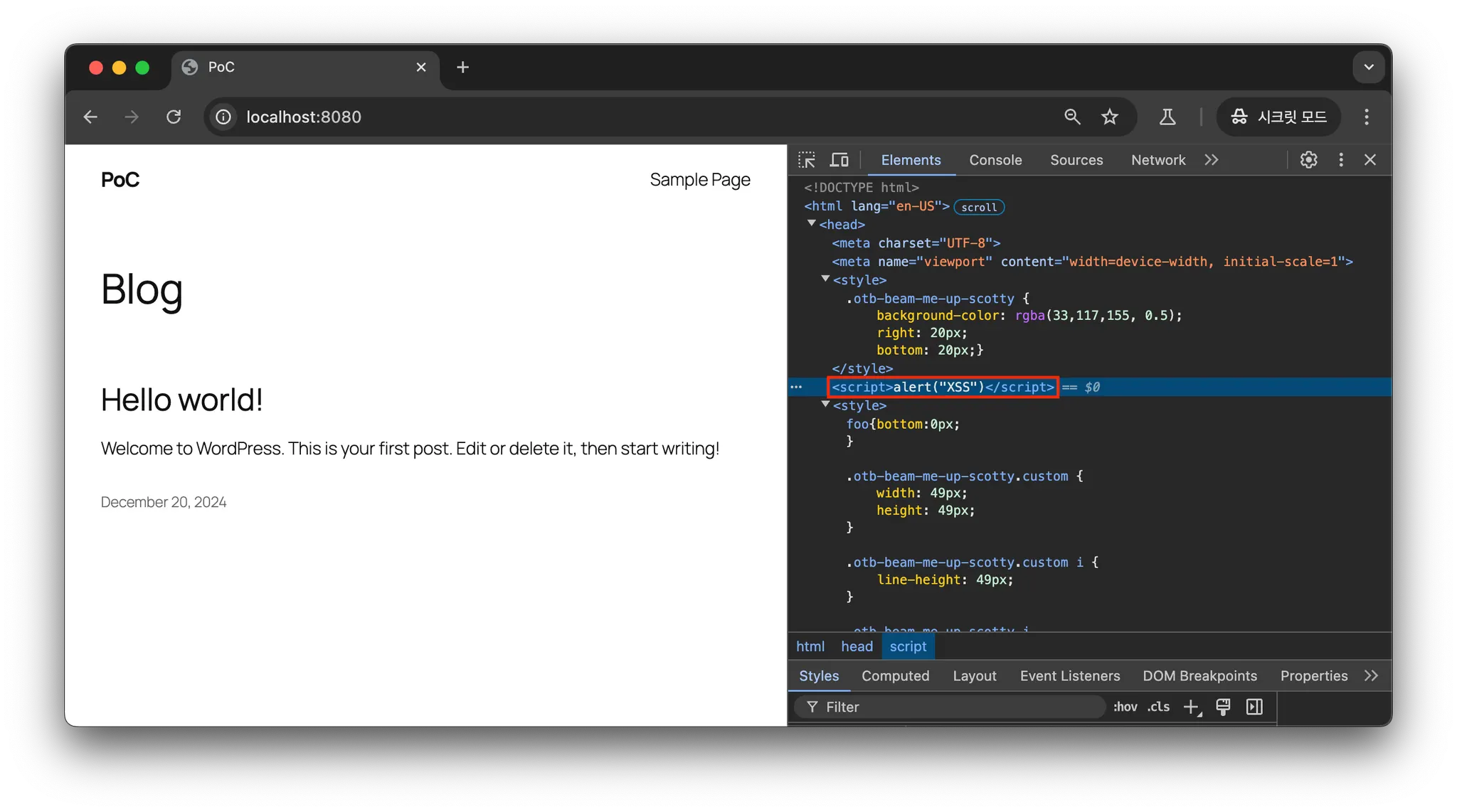 이후, 워드프레스 사이트로 접속하면 XSS 취약점이 발생하는 것을 확인하실 수 있습니다.