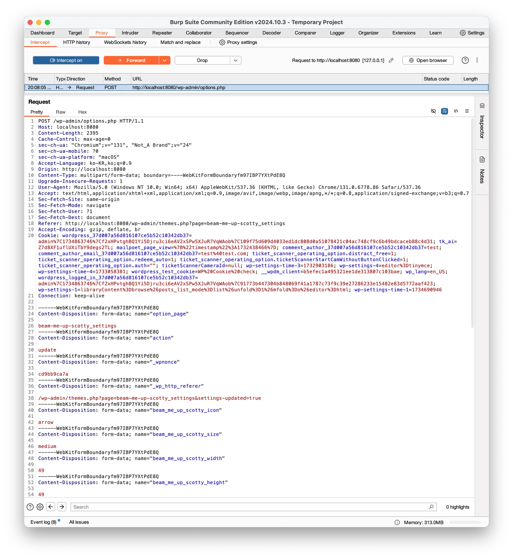 Proxy 도구(예: BurpSuite)의 Intercept를 활성화한 상태에서 back to top 버튼 설정 메뉴 하단의 'Save' 버튼을 클릭하여, back to top 버튼 커스터마이징 설정값을 저장하는 요청 패킷을 Intercept합니다.