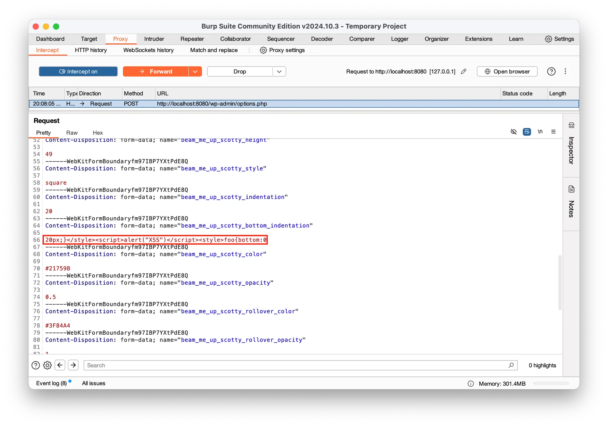 요청 페이로드 중 ‘beam_me_up_scotty_bottom_indentation' 페이로드의 값을 아래로 변경한 뒤, Forward를 수행합니다.