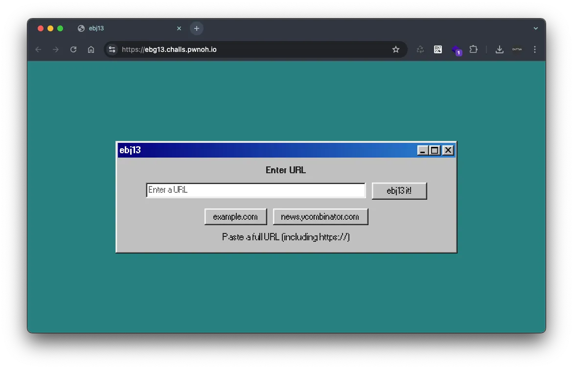 방금 전 확인한 문제 URL의 화면으로, 사용자가 URL을 입력할 수 있는 폼을 제공합니다. 그리고 해당 폼을 요청할 경우 엔드포인트 /ebj13 로 요청이 발생되며, 입력한 데이터는 URL 파라미터 url 로 전달됩니다.