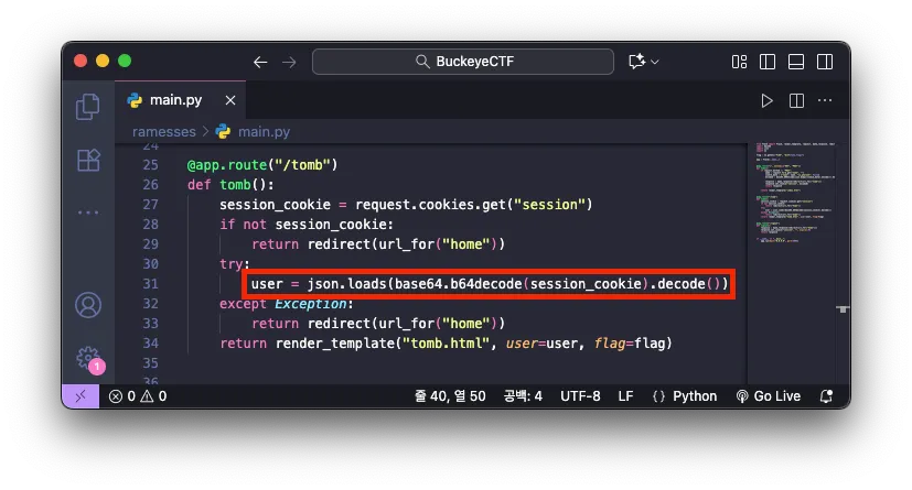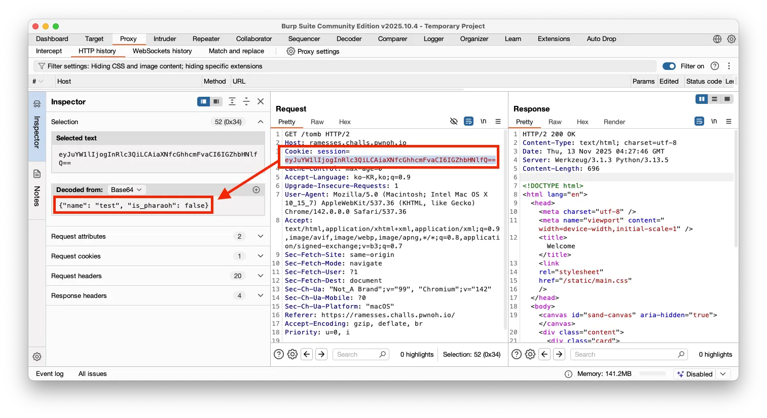 이후 프록시 도구에 캡처된 HTTP 패킷을 살펴보니, 리다이렉션된 URL /tomb 를 요청할 때 쿠키 session 에 Base64로 인코딩된 값이 포함되어 있었고, 이를 디코딩하니 {"name": "test", "is_pharaoh": false} 값이 담겨 있는 것을 확인할 수 있었습니다.