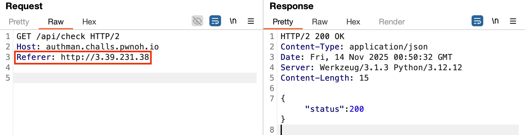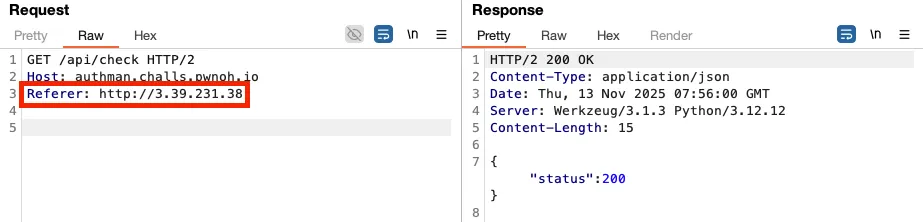 그리고 /api/check 로 요청을 보낼 때, Referer 헤더에 위 웹 애플리케이션 서버의 주소를 넣어 요청을 수행합니다.