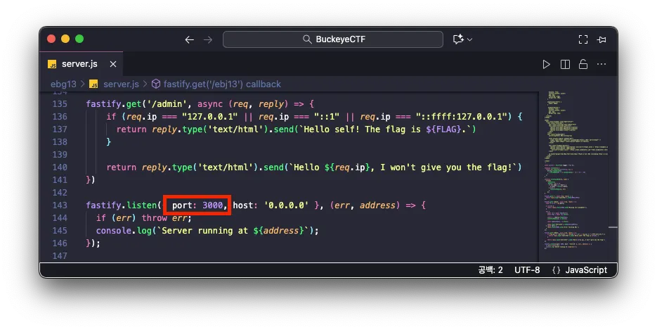 해당 엔드포인트의 구현부를 보면 플래그가 담겨져 있으며, 요청한 사용자의 출발지 IP 주소가 로컬호스트인 경우에만 플래그를 반환합니다.