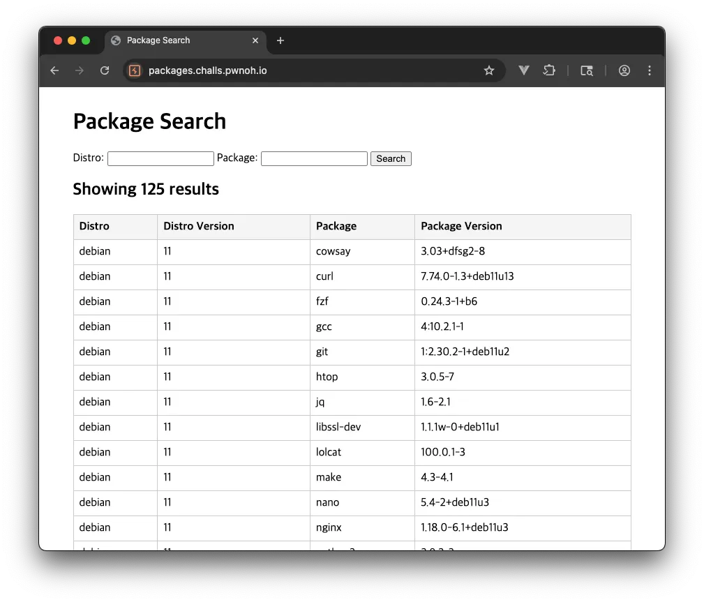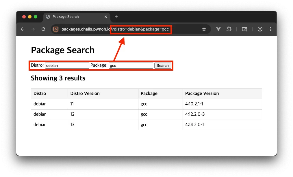 위 페이지 상단에 있는 입력 폼에 값을 입력하고 ‘Search’ 버튼을 클릭하면 입력 값이 URL 파라미터로 전달되어 입력 값에 해당하는 정보가 조회되는 것을 확인할 수 있었습니다.