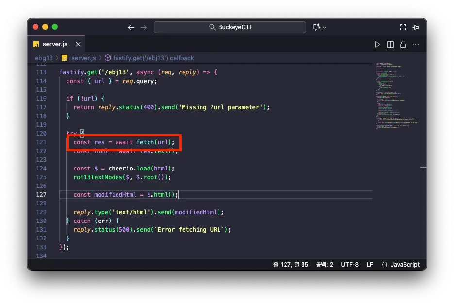 그리고 서버 자신이 요청을 수행하기 위해 엔드포인트 /ebj13 의 처리 과정에서 URL 파라미터 url 이 fetch 함수의 인자로 전달되므로 SSRF(Server-Side Request Forgery) 취약점을 이용합니다.