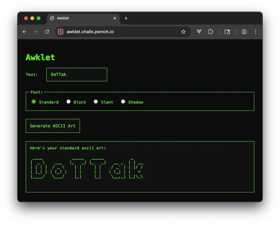 해당 문제의 URL에 접속하면 입력한 텍스트를 선택한 폰트의 아스키 아트로 렌더링하는 페이지가 등장합니다.