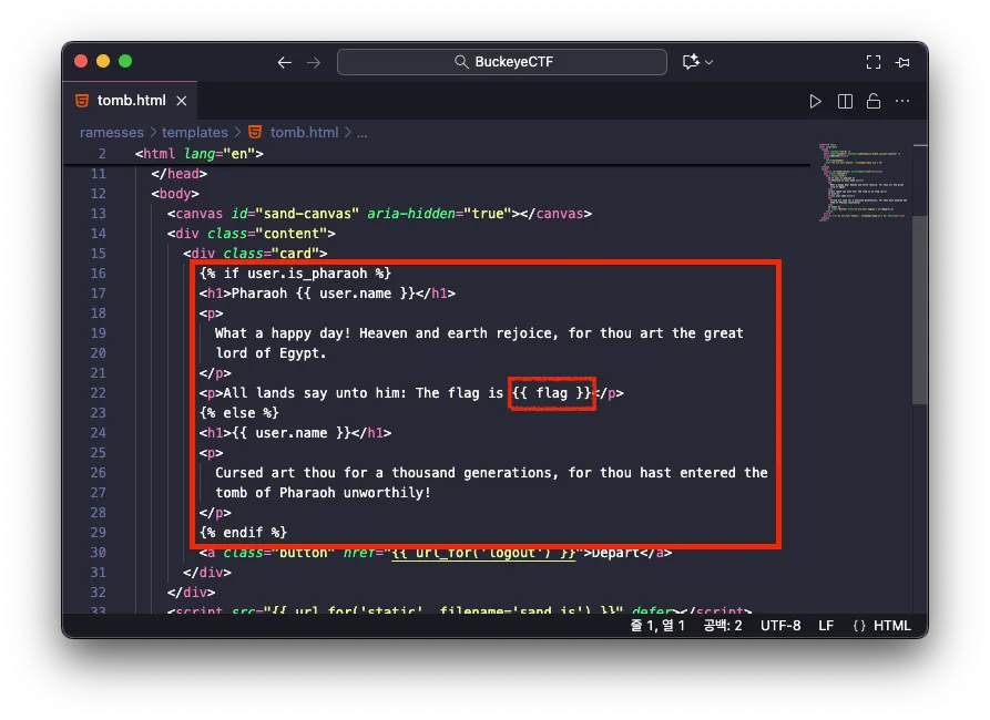 또한, 템플릿 tomb.html 에는 템플릿 컨텍스트로 전달된 user 의 is_pharaoh 가 참인 경우에만 플래그가 조회되는 것을 알 수 있습니다.