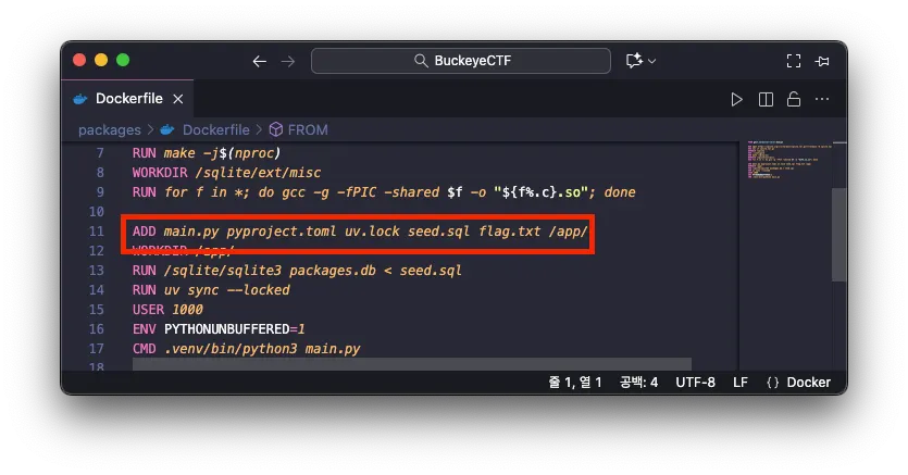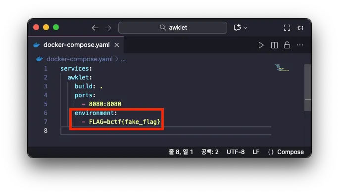 또한, 플래그 정보는 다음과 같이 docker-compose.yml 파일에 환경변수 FLAG 로 저장되어 있는것을 알 수 있었습니다.