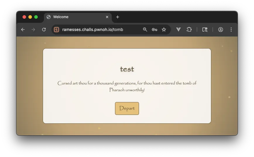 위 페이지의 입력 폼에 임의의 값(Name: test, Password: test)을 입력하고 요청을 수행하자 URL /tomb 으로 리다이렉션되었고, 화면에 "Do you dare enter the tomb of Pharaoh Dave Ramesses?" 라는 메시지가 표시되었습니다.