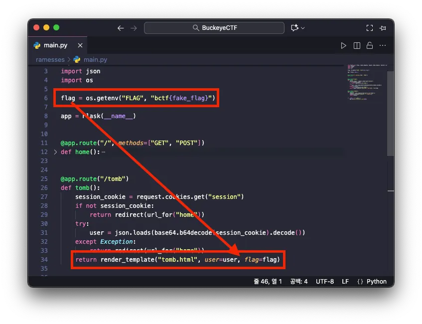 문제의 소스코드를 살펴보니, 리다이렉션된 URL /tomb 의 엔드포인트 구현부에서 템플릿 tomb.html 을 반환합니다. 이때 템플릿 컨텍스트로 user 와 flag 를 전달하고 있으며, 플래그가 flag 로 전달되는 것을 발견했습니다.