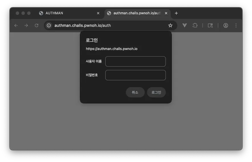 강아지 그림을 클릭하면 새 탭으로 /auth 페이지가 열리며, 인증을 요구하는 페이지가 나타나는데 제공된 정보가 존재하지 않아 401 Unauthorized 응답만 받게됩니다.