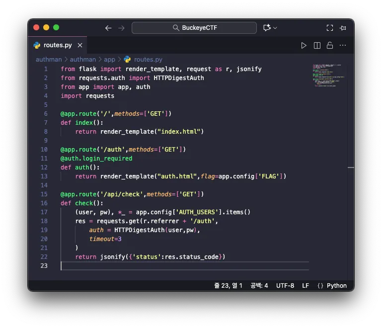 제공된 소스코드 중 route.py 에는 문제에서 제공하는 엔드포인트 /, /auth, /api/check 의 구현부를 확인할 수 있었습니다.