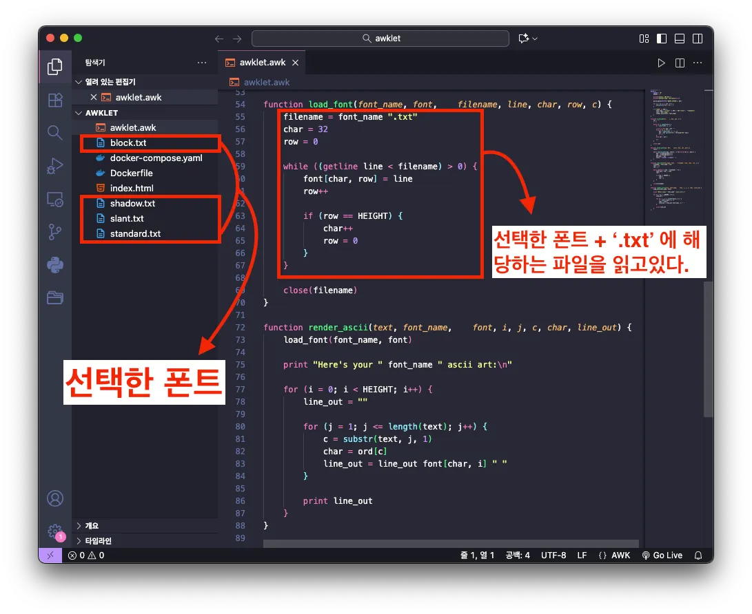 입력한 텍스트를 아스키 아트로 변환하는 요청 URL /cgi-bin/awklet.awk 에 해당하는 소스코드를 살펴보니 awklet.awk 파일을 확인할 수 있었습니다. 이 파일에서 입력한 텍스트를 아스키 아트로 변환하는 render_ascii 함수를 발견했고, 이 함수가 선택한 폰트를 load_font 함수의 인자 font_name 으로 전달하여 해당 텍스트 파일(font_name ".txt")을 불러오는 것을 확인했습니다.