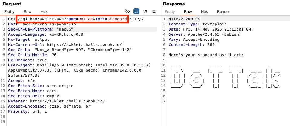 위 페이지에서 텍스트를 입력하고 ‘Generate ASCII Art’ 버튼을 클릭하면 URL /cgi-bin/awklet.awk 로 요청이 발생되며, URL 파라미터 name 에는 입력한 텍스트를, font 에는 선택한 폰트가 담겨져 요청이 발생됩니다.