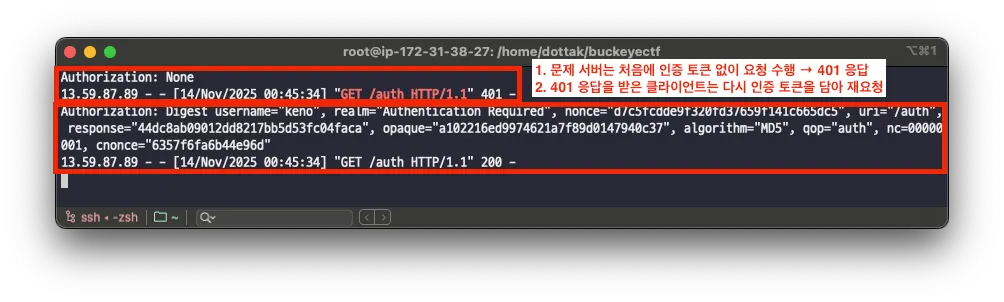 이후 문제 서버의 /api/check 를 다시 요청하면, 문제 서버가 처음에 401 Unauthorized를 받은 후 인증 토큰을 담아 재요청하는 것을 확인할 수 있습니다.