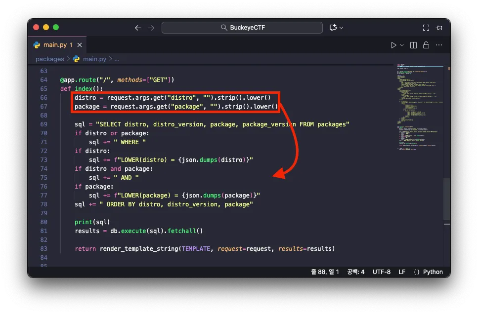 문제에서 제공하는 소스 코드를 살펴보니 다음과 같이 사용자로부터 입력 값을 전달 받아 SQL 질의문에 전달되는 것을 알 수 있었습니다. 이때, 입력 값은 필터링을 수행하지 않고 json.dumps 함수로 전달한 결과를 질의문에 그대로 전달하고 있는 것을 알 수 있습니다.