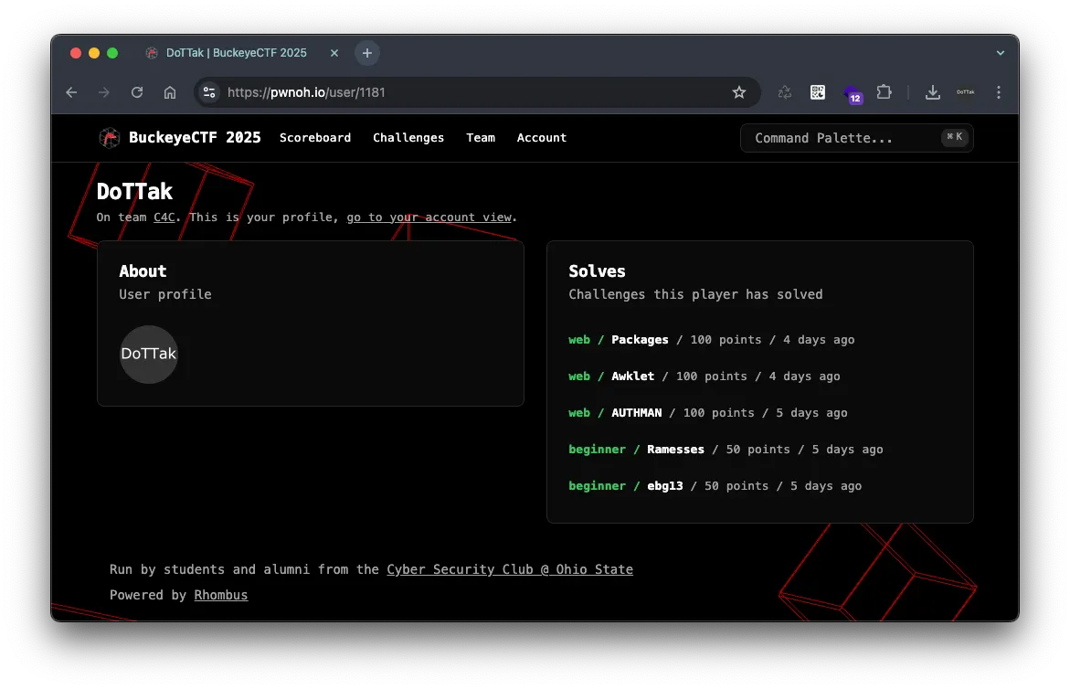 BuckeyeCTF는 오하이오 주립대학교 사이버 보안 클럽 학생들이 운영하는 대회로 3일(@11/8/2025 → 11/10/2025) 동안 진행되었으며, 문제는 웹, 리버싱, 포너블, 암호학 등 다양한 카테고리에서 초보자 친화적인 문제들이 출제되었습니다.